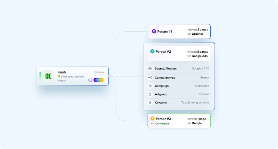 While Leadfeeder primarily focuses on online interactions, integrating it with CRM systems can facilitate tracking of offline conversions back to online ads. Let’s say Person A from a company landed on your product via your Google ad campaign. They were impressed and informed their boss about it who decided to call the company directly. A deal is opened for that company in the CRM after the call. This data is synced with Leadfeeder via our CRM integrations and we now start showing you visits from that company backtracking to the first time they visited your website from the Google ad campaign.