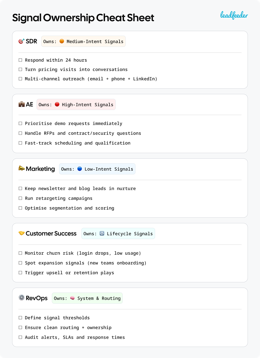 - SDRs own medium-intent signals; their job is to act within 24 hours and turn a pricing page visit into a conversation.