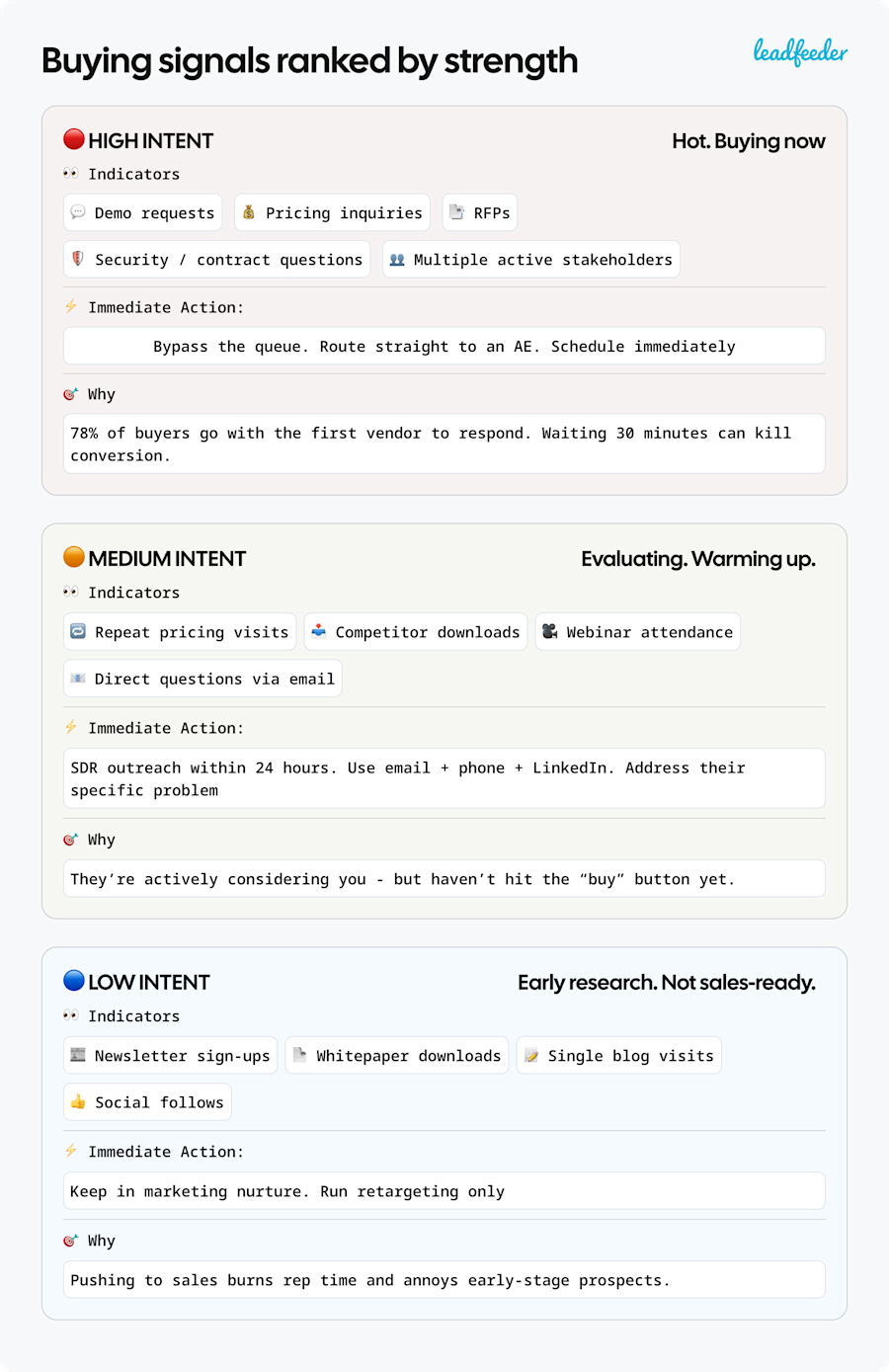 You don’t have to overcomplicate implementing them, just choose three signals today, create an easy plan for each and see what happens. If the majority of your pipeline relies on forms, consider adding an identification and intent platform like Leadfeeder to reveal companies who’re researching you right now.