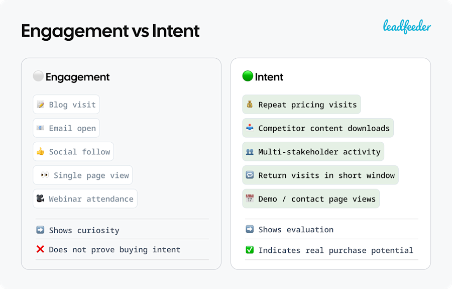Engagement is broad and passive, like reading a blog post or opening a marketing email and don’t signal real intent.