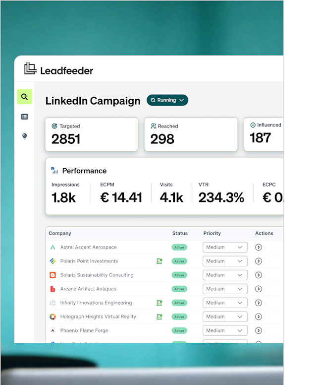 Launch targeted B2B display campaigns directly from Leadfeeder using your prioritized audiences — and sync them to your CRM or ad platforms to drive more efficient, high-performing campaigns.